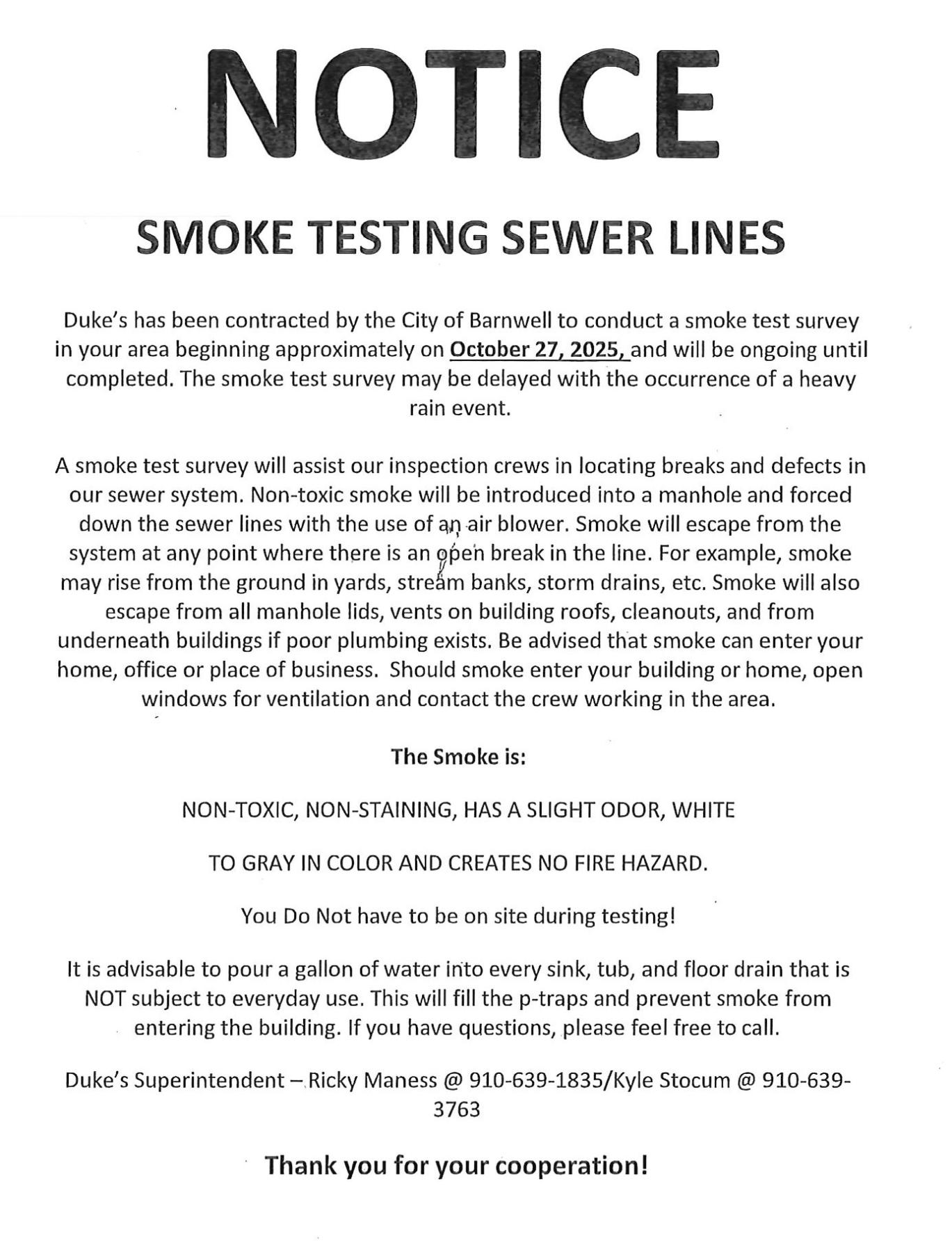 Dukes has been contracted by the City of Barnwell to conduct a smoke test survey in your area beginning approximately on October 27, 2025, and will be ongoing until completed. The smoke test survey may be delayed with the occurrence of a heavy rain event.